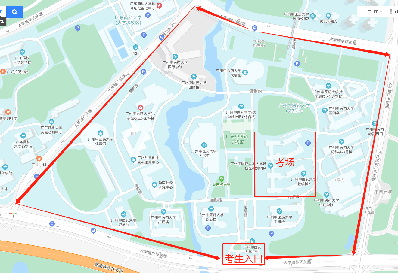 广州市番禺区广州大学城外环东路232号广州中医药大学(大学城校区)教学楼(A、B区),具体考室以准考证为准。