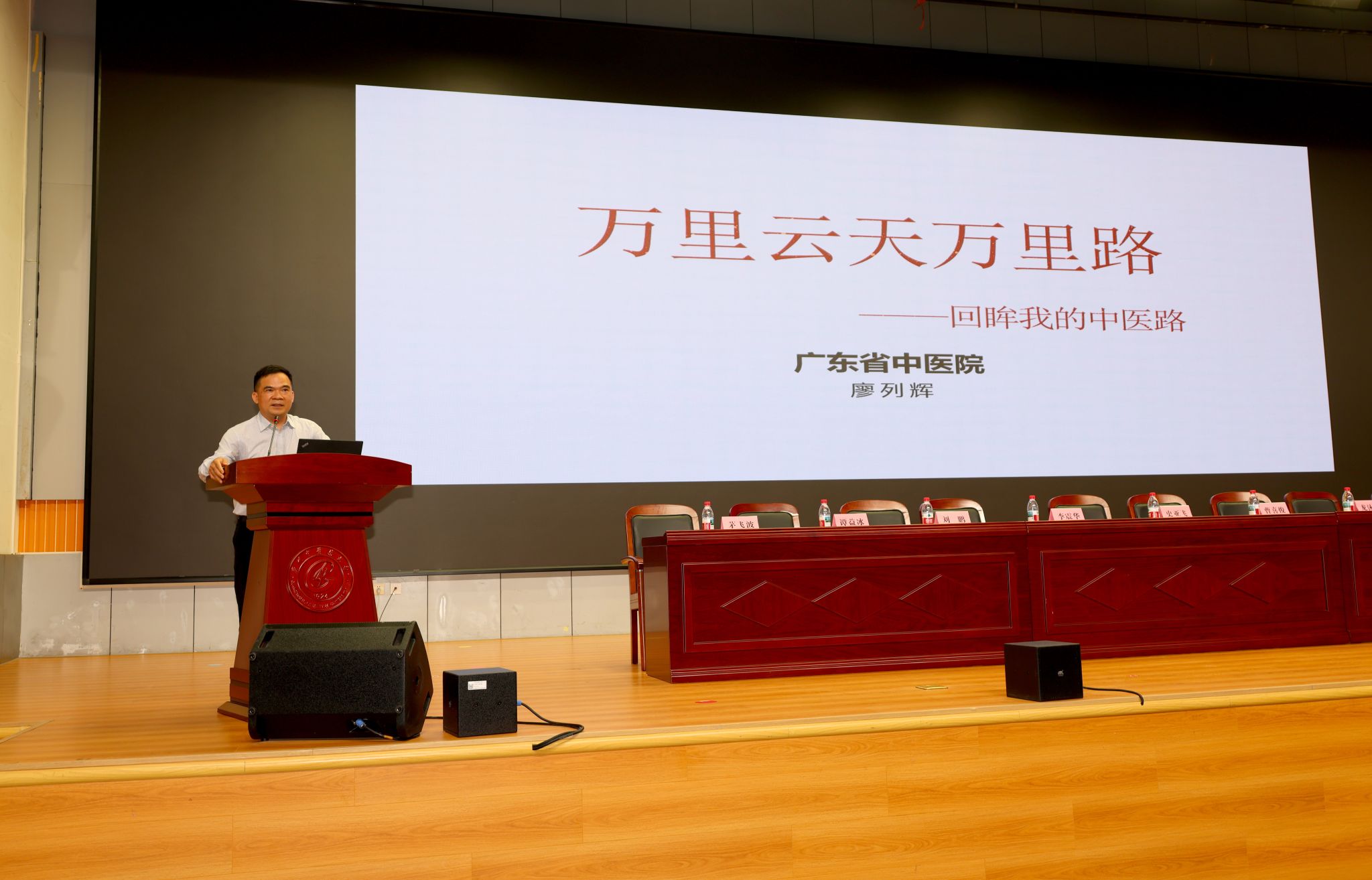 典礼结束后,广东省中医院皮肤科教授、主任医师廖列辉以“万里云天万里路——回眸我的中医路”为题,为新生讲授开学第一课。他从邓铁涛先生五次上书守护中医命脉的壮举讲起,回顾了自己从懵懂实习到知耻后勇、问道经方的曲折历程。廖教授强调,中医传承需脚踏实地。他以自身救治疑难病症的亲身经历,展现了中医的独特魅力,激励新生坚定信念、勇担传承使命,为中医药事业发展贡献力量。现场反响热烈,掌声不断。