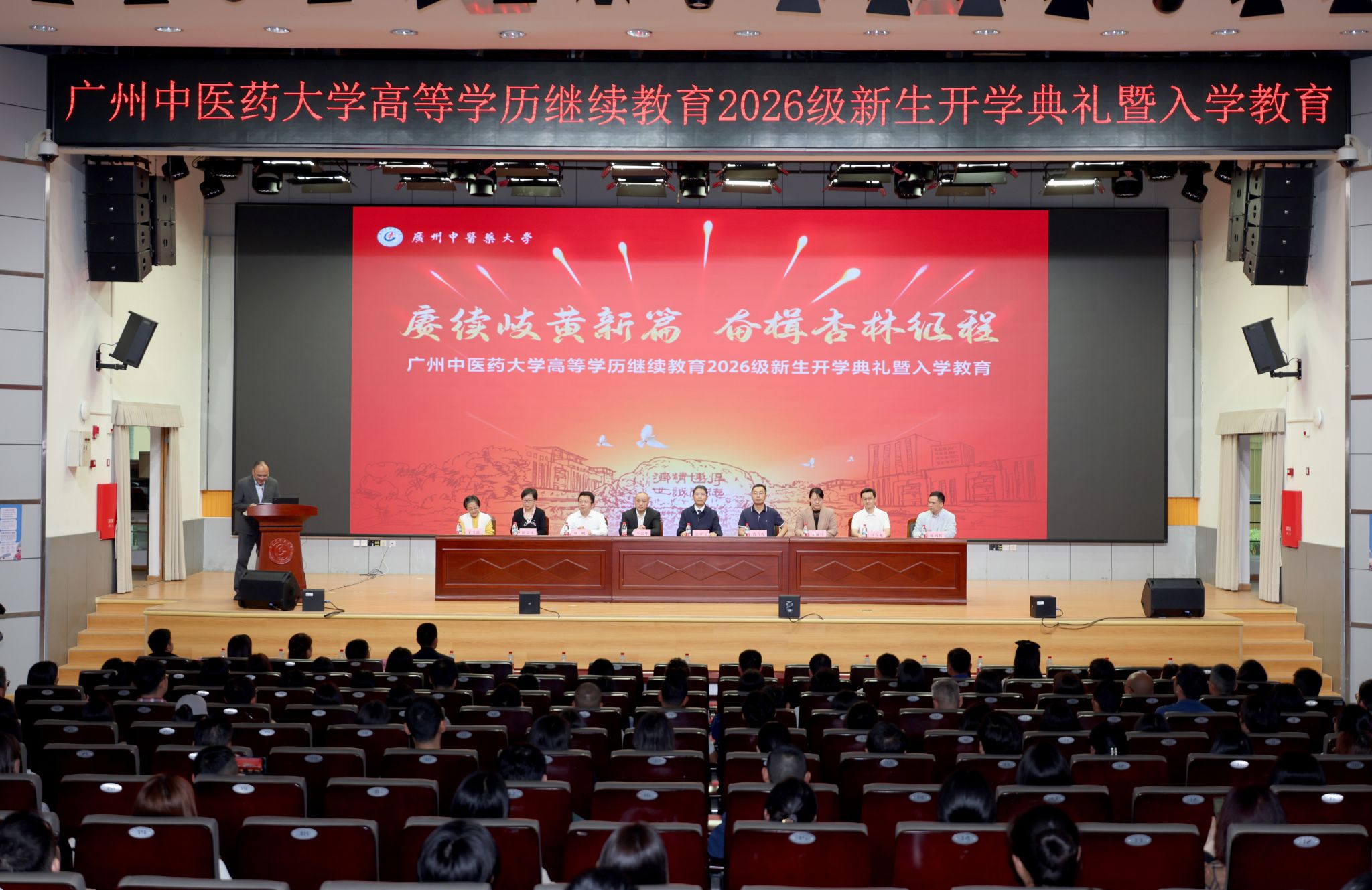 杏林迎新秀,岐黄续华章。2026年3月21日下午,广州中医药大学高等学历继续教育2026级新生开学典礼暨入学教育在大学城校区国际会议厅隆重举行。学校党委常委、副校长史亚飞,相关职能部门及各学院负责人,与近550名新生代表齐聚主会场。典礼通过线上直播同步进行,全省22个校外教学点设置分会场,新生们线上线下共赴这场岐黄之约。